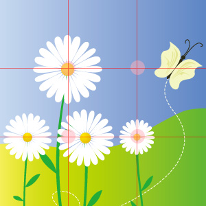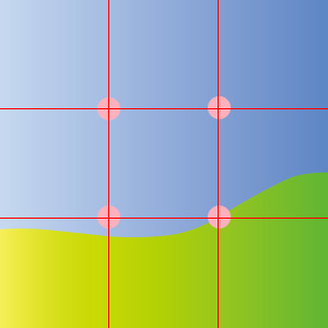 一番重要な要素が構図のバランスを崩さない時は、一番重要な要素を4つの交点の一番バランスがいいところに配置して、二番目に重要な要素を対角線上の交点に配置すると美しい構図になるよ(^^) あと、デザインに縦また横の方向性が強い要素がある時は、その要素を対応する格子線に合わせるのが一般的かな。
